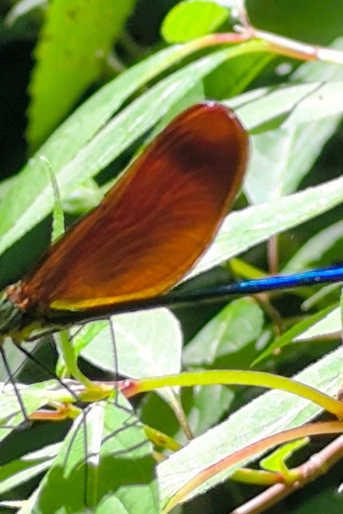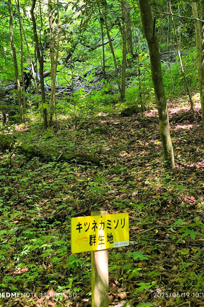 ここにはキツネノカミソリの群生地が2箇所あり8月上旬に一面に咲き誇る。あちこちにシオジも。ちょうど中腹辺りに源流があり、メチャ汗🥵をかいたので渓流で顔を洗いタオルを水に浸す。見上げるとカワトンボが岩に。
