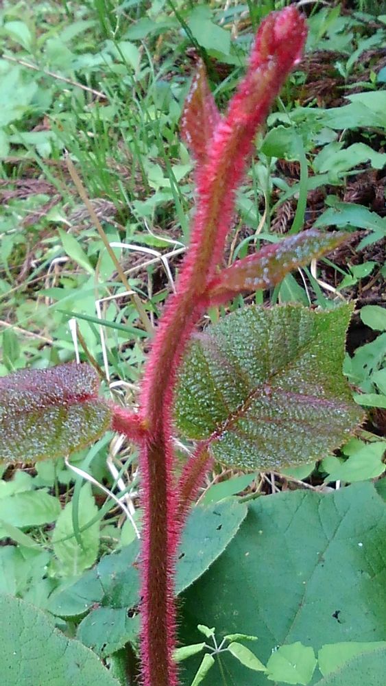 辺りの葉を見たらクズに似てるけどクズは赤くないらしい。Googleはエビガライチゴと言うけどトゲがない。