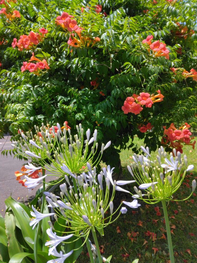 アガパンサスとノウゼンカズラ夏のお花のコラボだね💜🧡素敵ですね〜コラボ写真が好きなんです🤭