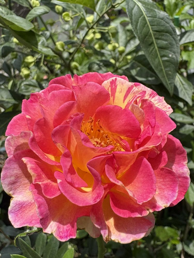 このバラの咲く一画は、庭でも華やかな場所になります😊🎶