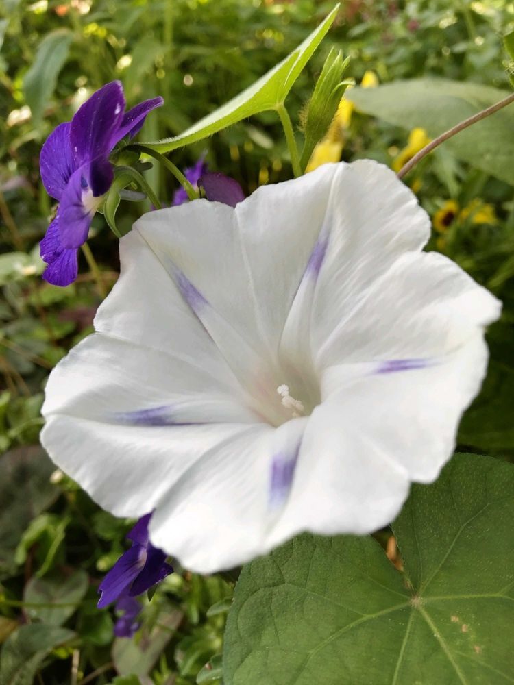 🤍こぼれ種からの朝顔ミルキーウェイ、ビオラの茎に巻き付いています。