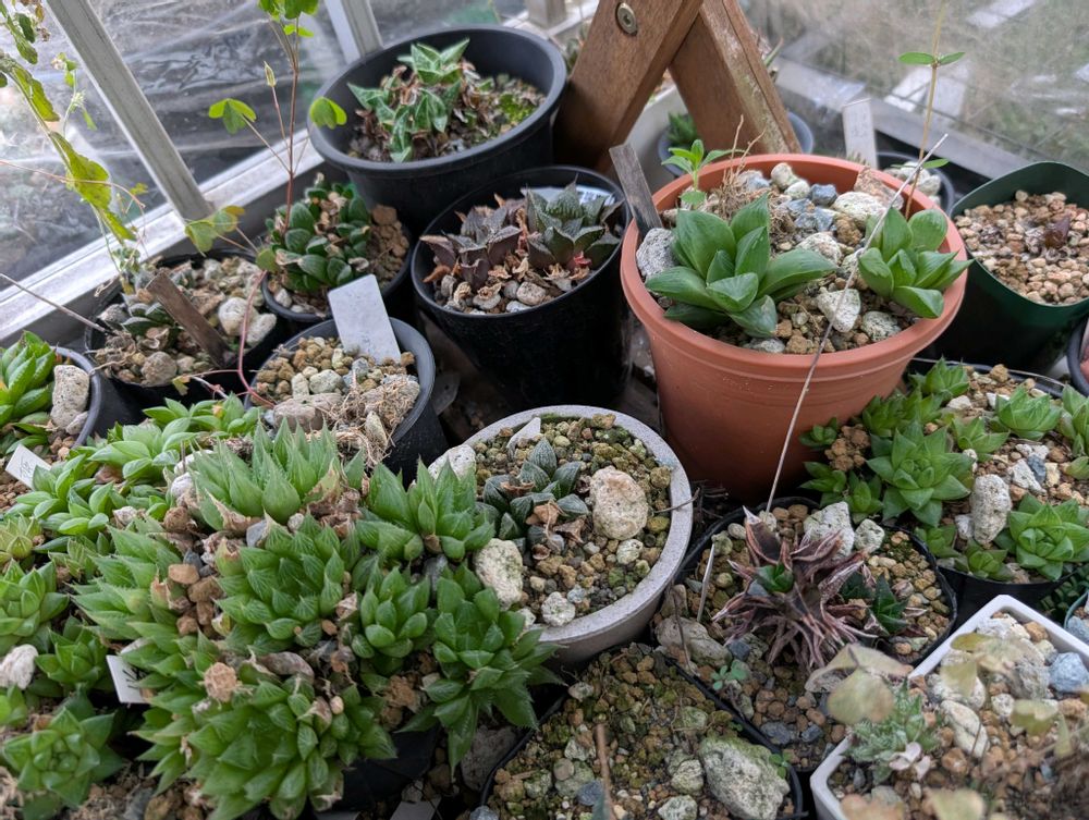 一年中、ベランダ出しっぱなしのハオルチア(写真内にハオルチア以外も写っております)。ハオルチアを一年中出しっぱなしって正気の沙汰じゃないって自分でも思ったけど、もう3年目に突入しただろうか。★になった子も多数いるが、生き延びた子たちは逞しい。この撮影後、写真に写っているハオルチアたちに★になった子の鉢から土をかけてしまいます。少し窓が出る程度。現地を再現(笑) ベランダ出しっぱなしにしてから美しさよりも逞しさ、荒々しさを求めるようになりました(^_^;)