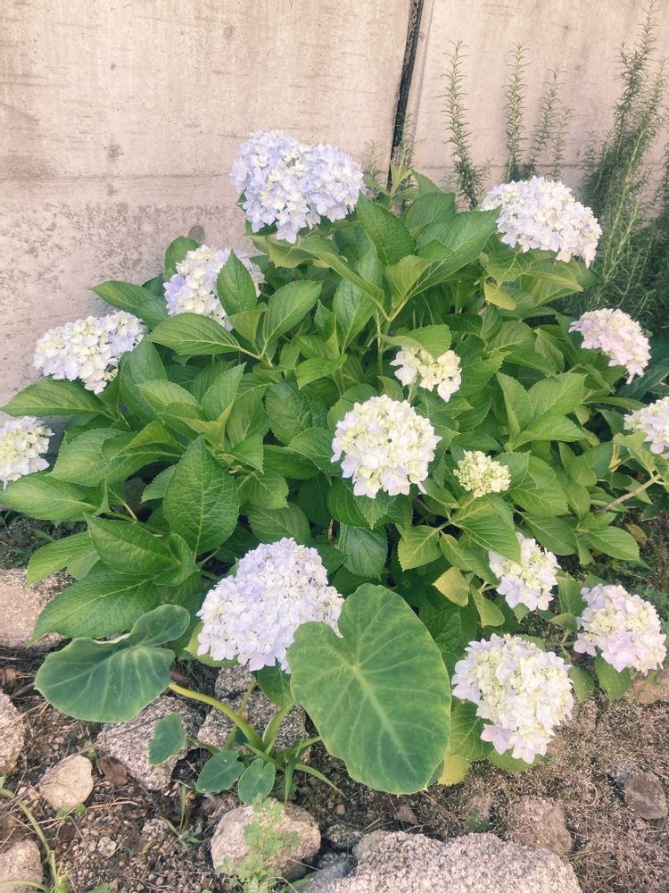 なぜかアジサイの前にサトイモが生えて来てびっくり🫢