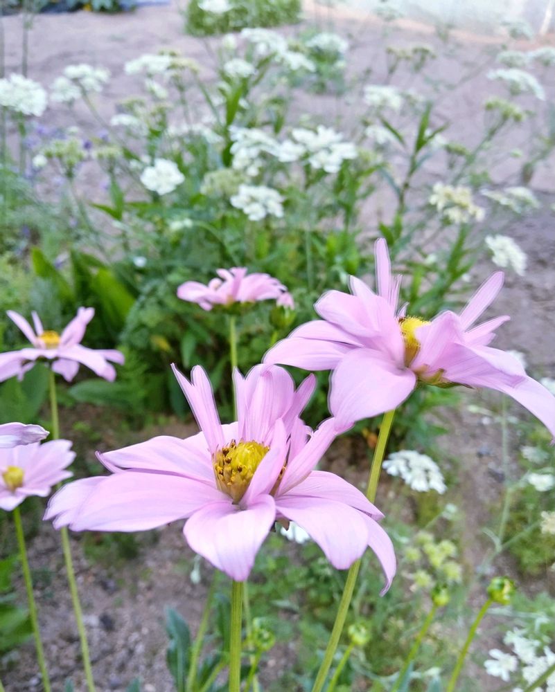 キャンディコスモスとオルレア背比べして咲いてます🌸🤍🌸🤍🌸