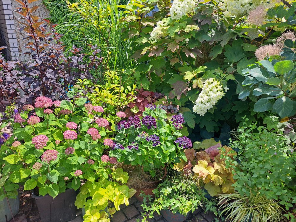 カシワバアジサイとスモークツリー以外は、鉢植えなので、行き感じのものだけ寄せ鉢にしてます💕