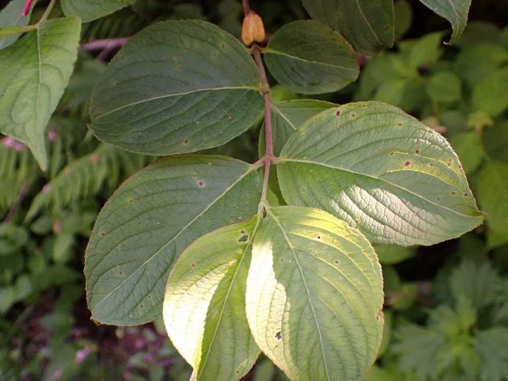 葉は、対生。長さ7㎝くらい。卵状楕円形。先は、尖り、基部は、円形、または、くさび形。縁には細かい鋸歯がある。裏に白い毛があるらしい。葉柄は、短く、毛があり、赤みを帯びています。(④)