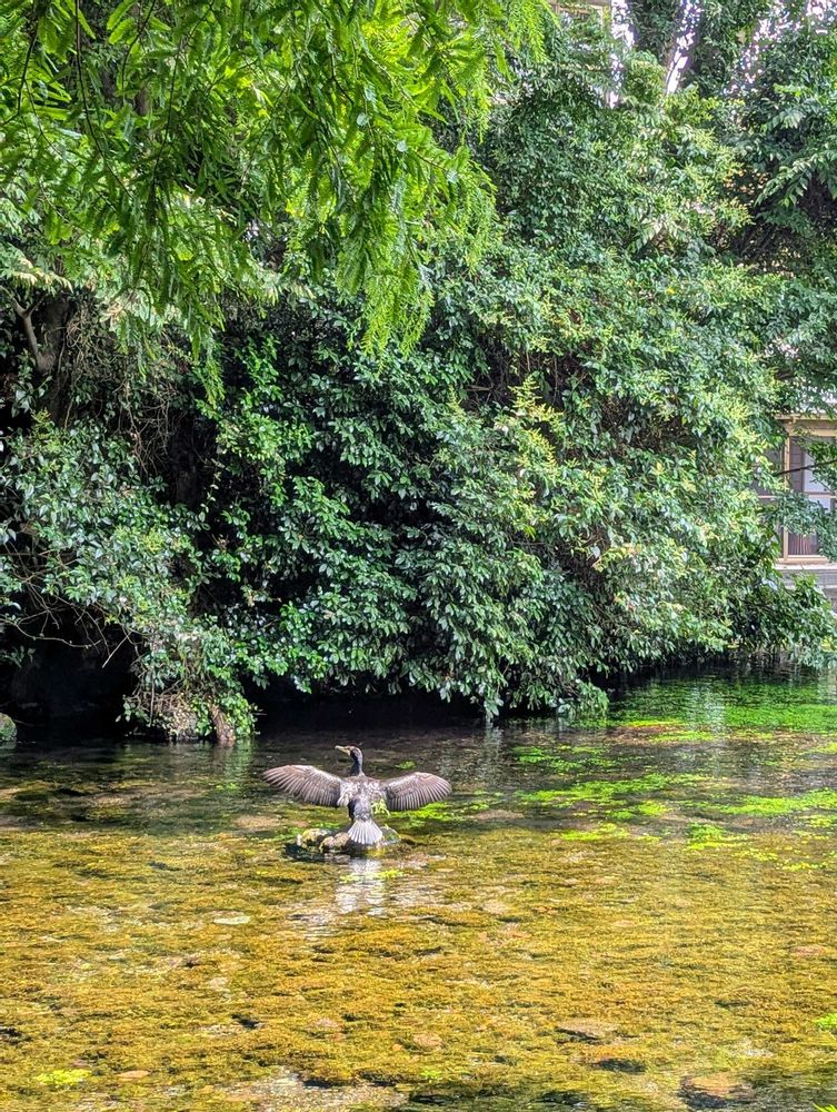 座って足を乾かしてたら、スッとカワウが池の真ん中の岩に舞い降りて😳!