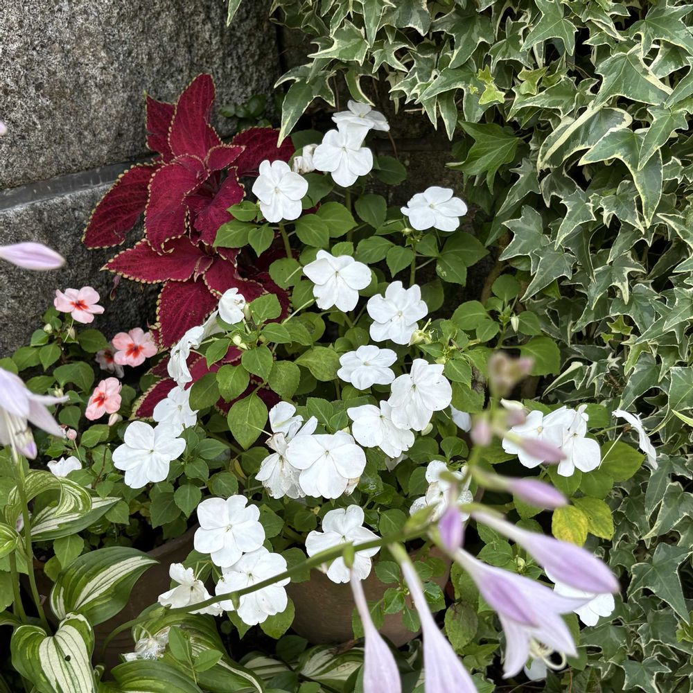名前が思い出せない!🤔💦エクメア グラシリスでした。😅2️⃣宿根サルビア、冬越しして大きくなりました☺️👍3️⃣インパチェンスとコリウス、優しいギボウシのお花も咲きました🌸🩵
