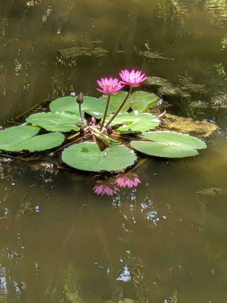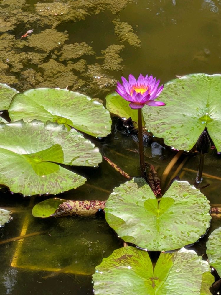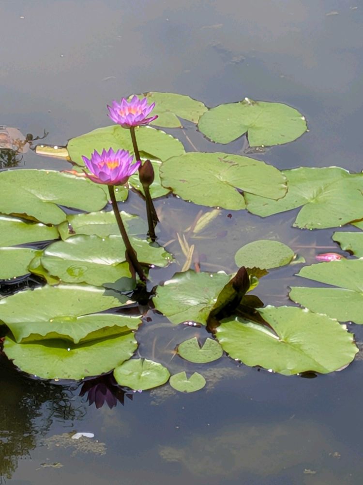 熱帯スイレンは水面から花柄を出します。赤色や、ピンク色に加えて青色、紫色など花の色が豊富で、夜咲きの系統もあります。