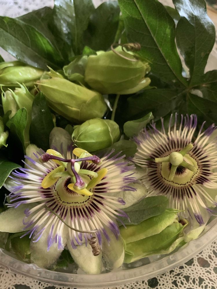 庭の時計草さんがジャングルのように生い茂ったので、すこし切りました😊捨てるのは可哀想なので、リースにしたり花手水風にしたりして眺めています💚⏰💚⏰💚