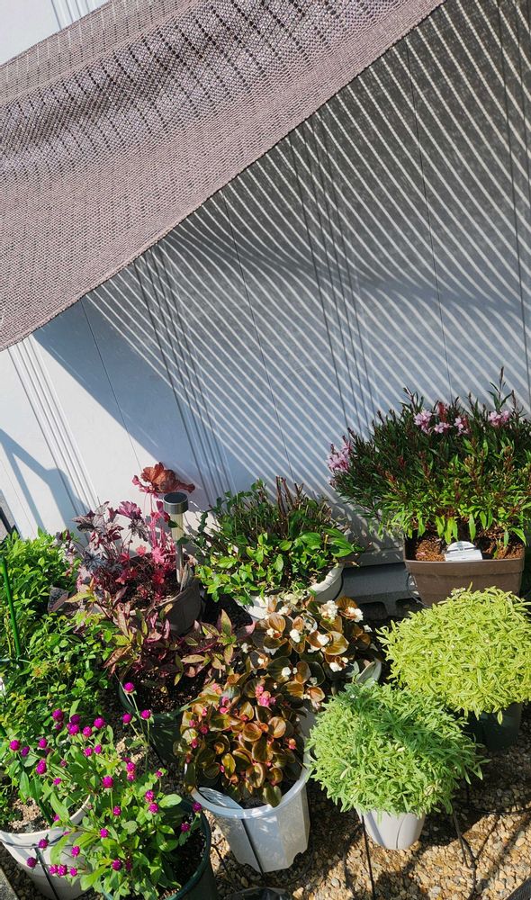高温に弱い子や、植え付けや植え替えしたばかりの鉢を、タープ下へ避難させました。