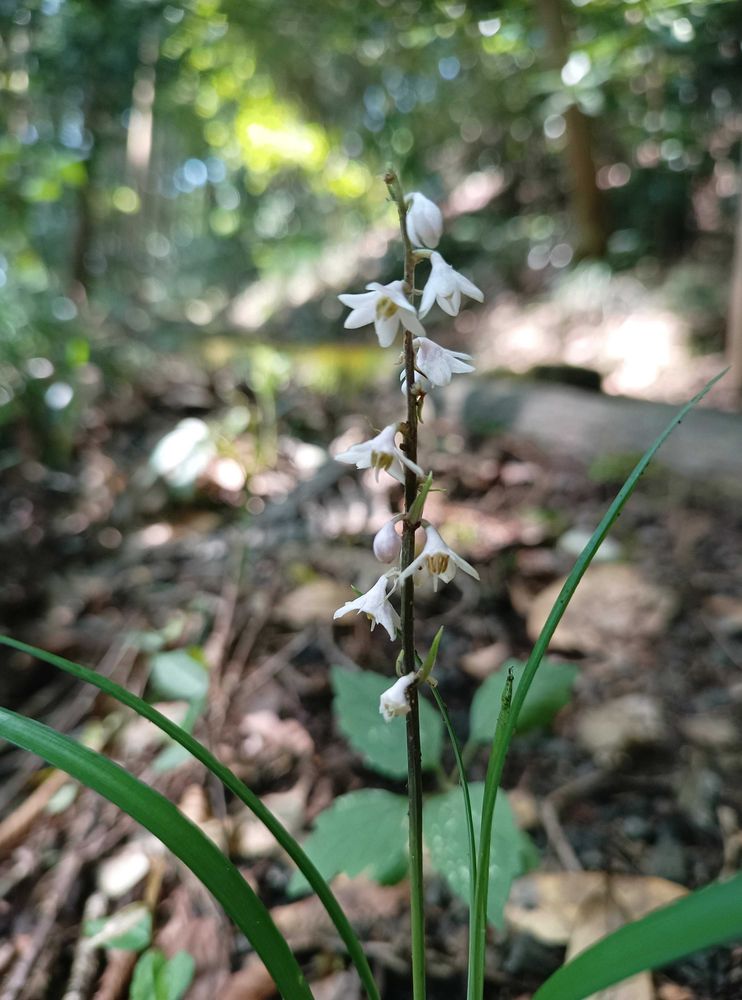 高さ15~30㎝。匐枝を伸ばし、群がって生える。根の先がところどころ紡錘状に太くなる。葉は長さ15~30㎝×幅4~7㎜、厚みがある。花茎は長さ15~25㎝、幅太く、しっかり立ちあがってつき、花を下向きにつける。花は数個ずつ、束生する。花茎は高さ20~30㎝、直立し、扁平。花は長さ6~7㎜×直径6~7㎜。花被片は6個、長さ6~7㎜、淡紫色~白色。雄しべ6個、花糸はごく短い。葯は黄色、細長く、先が尖る。花柱は円柱状、柱頭はわずかに3裂する。