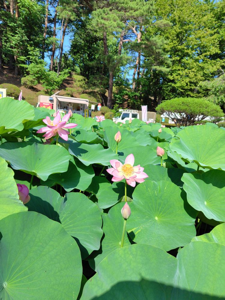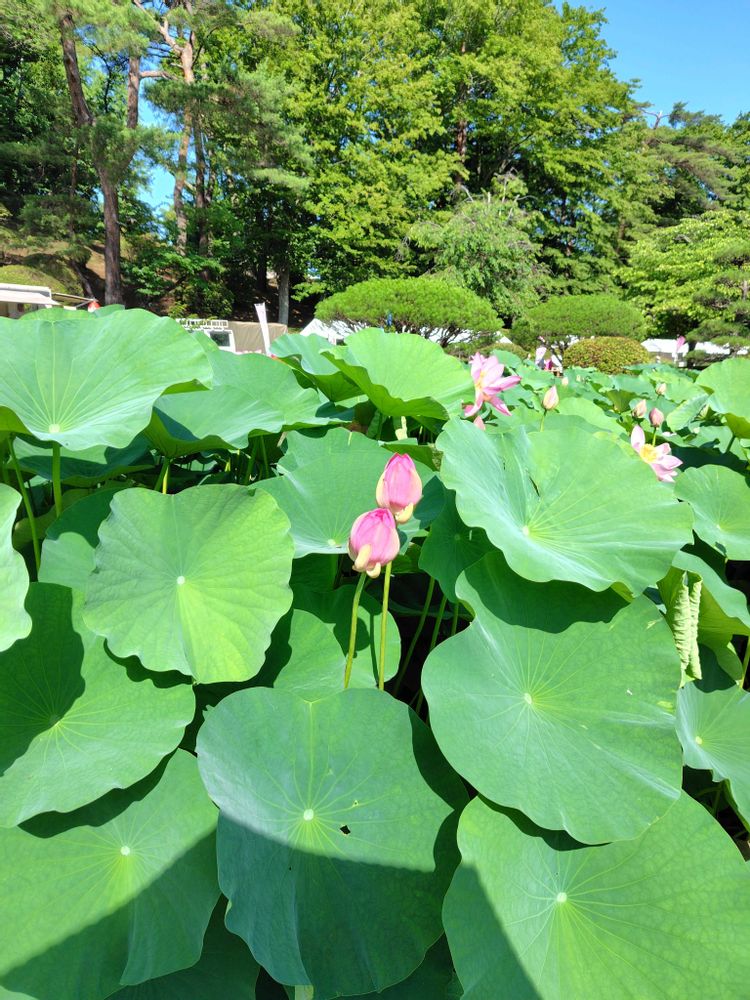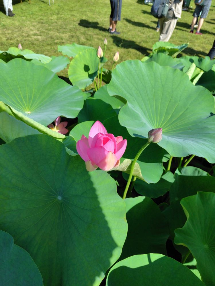 千葉公園の大賀ハスを見に来ました。8時でこの位の開花です。大きな花が楽しめます。
