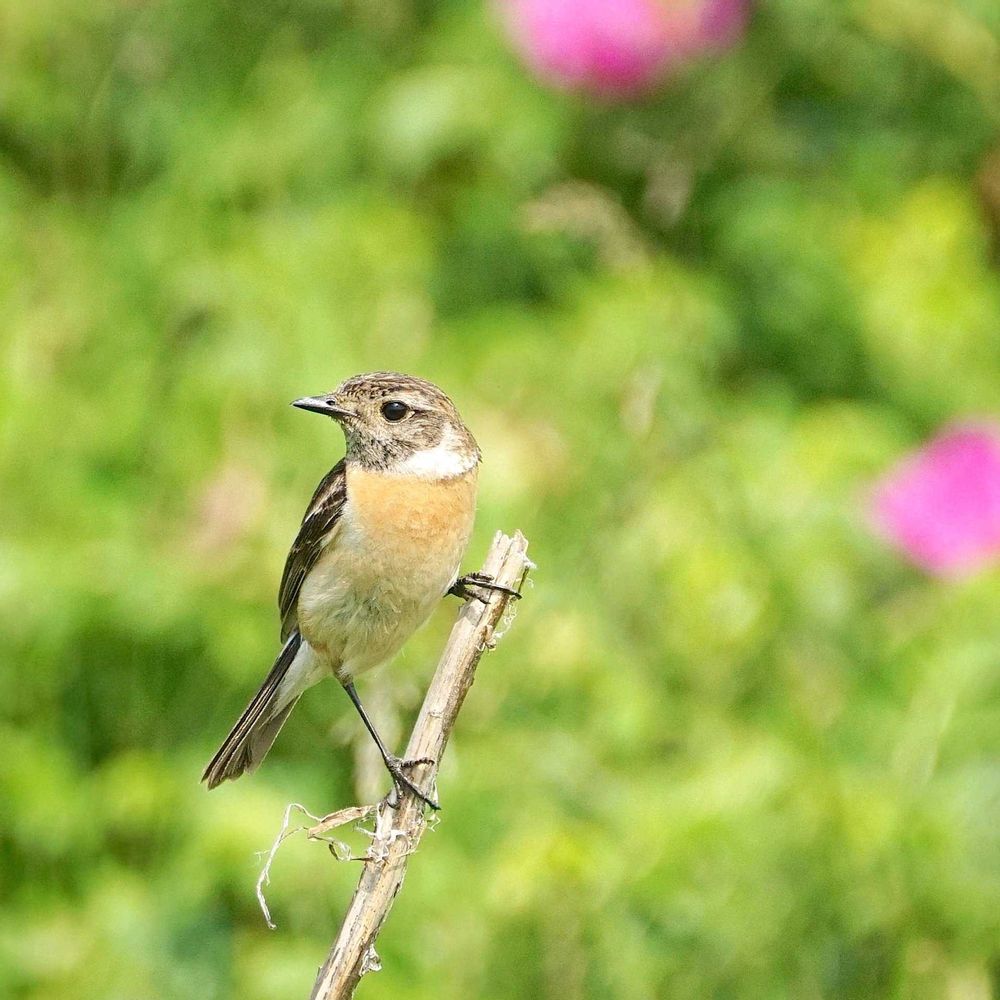 ハマナス背景のノビ子ちゃん(ノビタキ︎︎ ♀)😍