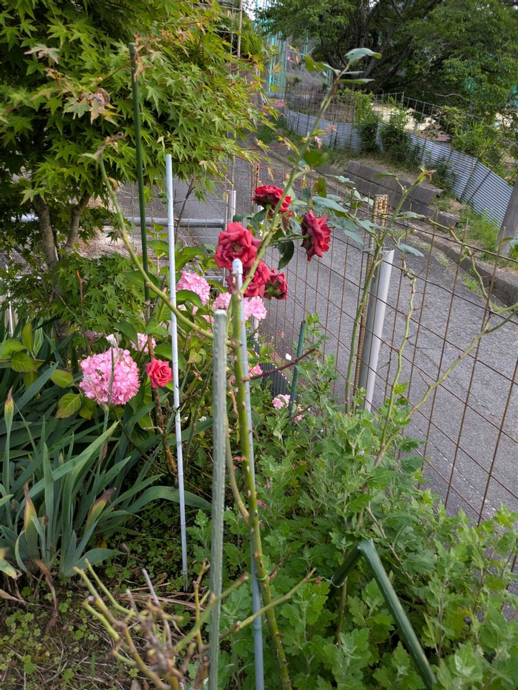 その下には🌹赤いバラとピンクのアナベルがまだ残ってます🩷🌿