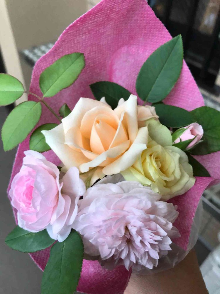 娘のお友達のバレエ公演へ、お祝いにベランダで咲いたバラたちで小さなブーケを作ってみました🍀夜まで萎れないで頑張ってほしいな。
