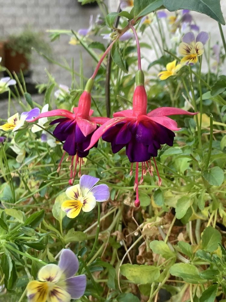 暑さに何とか耐えているフクシアと、我が家で最後のビオラとの共演♬