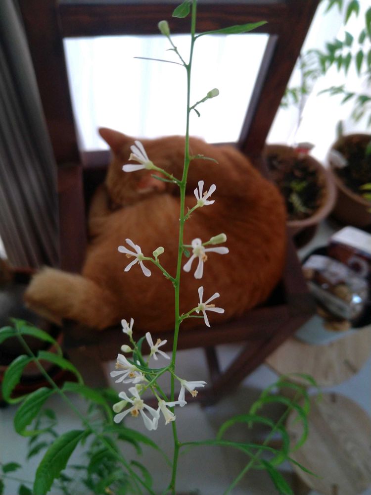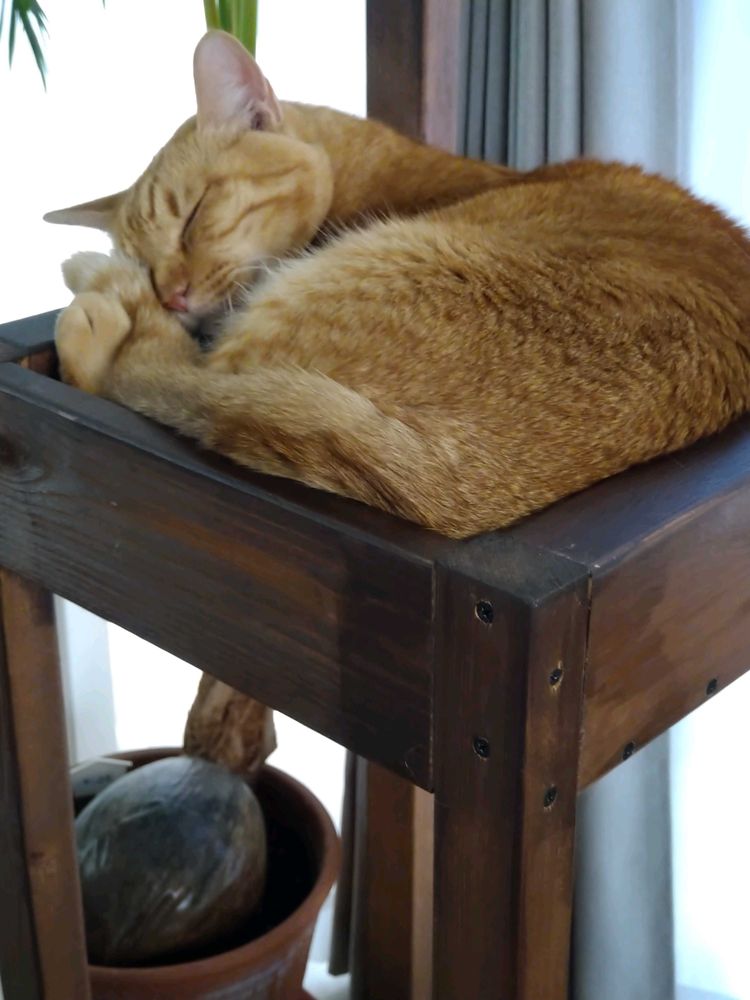 ①ワークショップで作った椅子ですやすや寝てるところを📸左下にヤシの実が写っています🌴