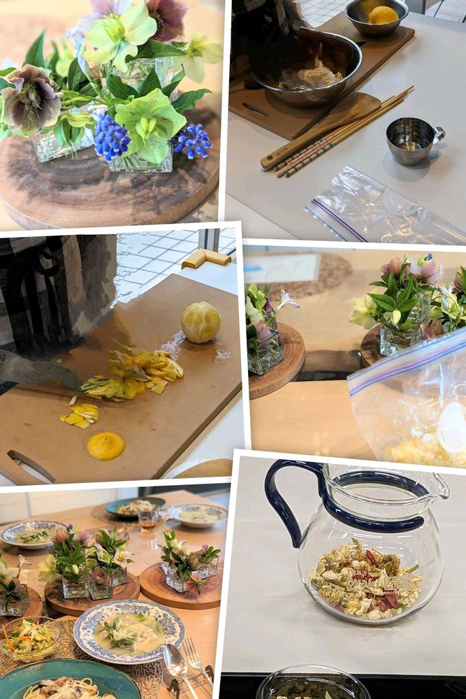 Googleフォトが「木曜日を振り返る」と題してコラージュしてくれました🍀😊✨2023年4月6日㈭🧑🍳発酵塩レモンのお料理教室でお花が飾っていました~♬♬発酵塩レモンを使った🧑🍳パスタ🍽️スープ🥗コールスローψ(´ڡ`♡) オイシー♪自家製の国産レモン🍋おうち薬膳の講座を受講しました( ^^) _旦~㊦㊨