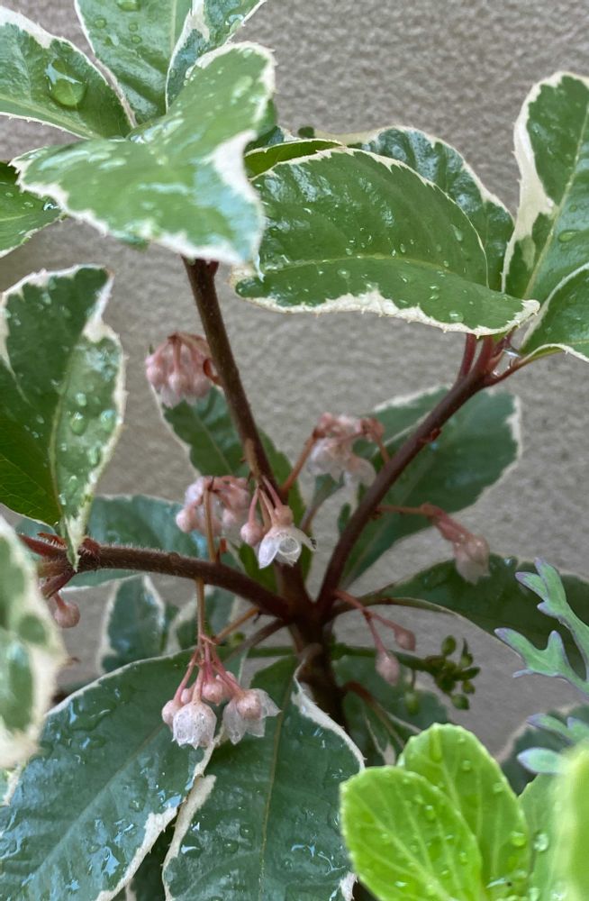 斑入りヤブコウジのお花も薄紅色の小さなお花が下向きに可愛いです💕