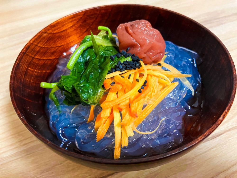 ちゅるんと食べやすい ところてんさんにトッピングして疲労回復と抗菌が得意な梅酢さんにタレに入って貰って