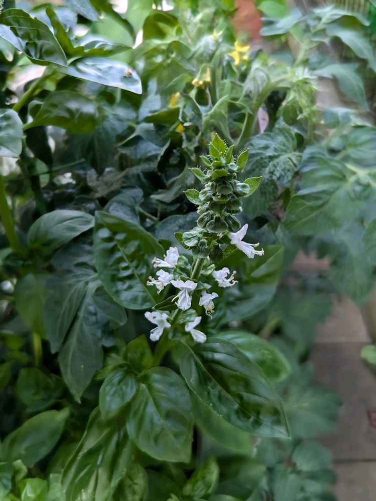 プランター栽培しているミニトマト🍅のコンパニオンプランツ・バジル🌿に可愛い白い小花🤍が咲きました😍✨