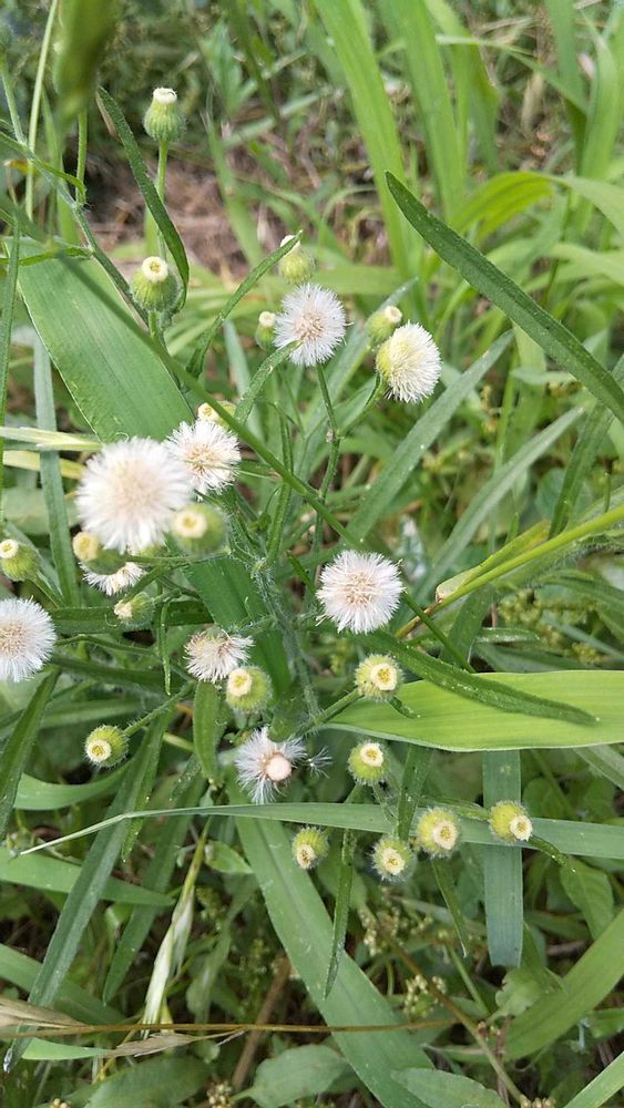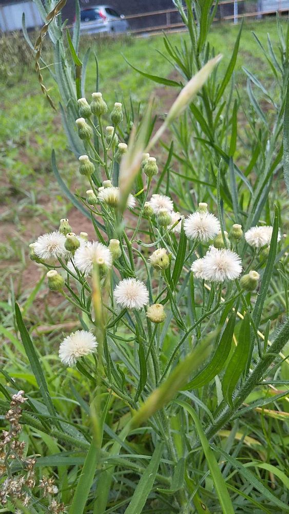 畑のまわりにモフモフ綿毛のアレチノギクが生えてます。①②