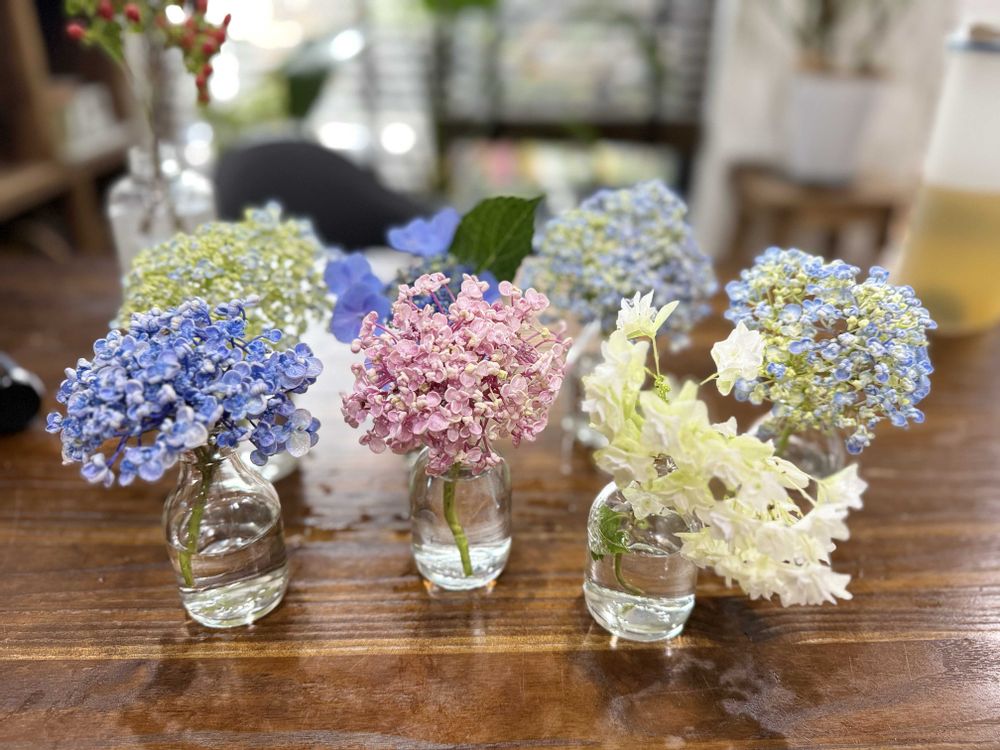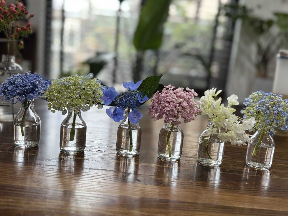 小瓶に一本ずつ紫陽花を入れるくらいなら私でもできる気がしてやってみました😊