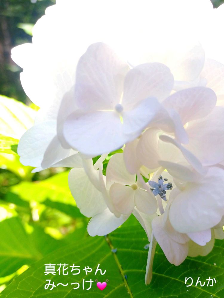 白い紫陽花の中の、小さな青