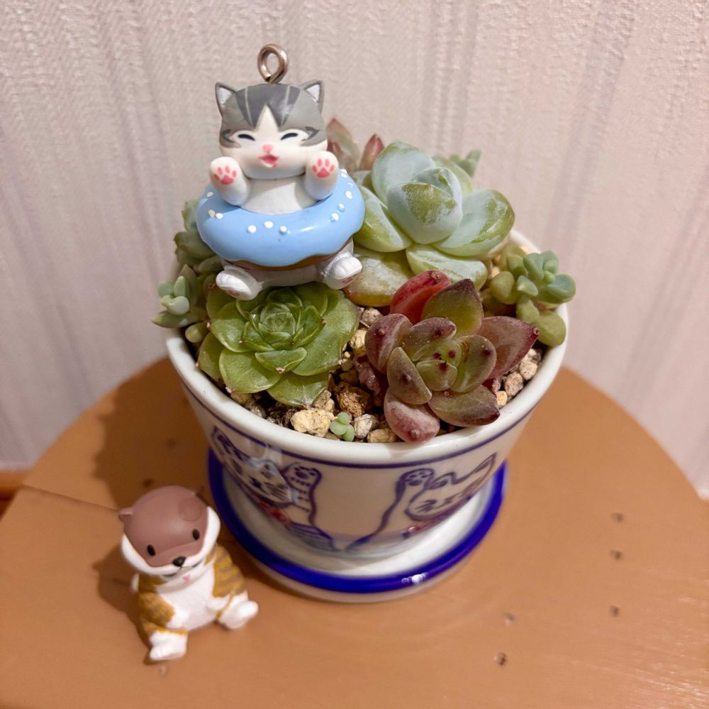 まつぴよさんにいただいた猫ちゃんの鉢の寄せ植えの上にいます🥰