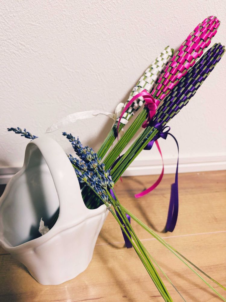 🪻ラベンダースティック作りのイベントに行きました 教えて頂き何とか 綺麗に出来ましたと褒めて貰い嬉しくなりました🥰お隣の境の隙間に顔を覗かせる半化粧 爽やかです