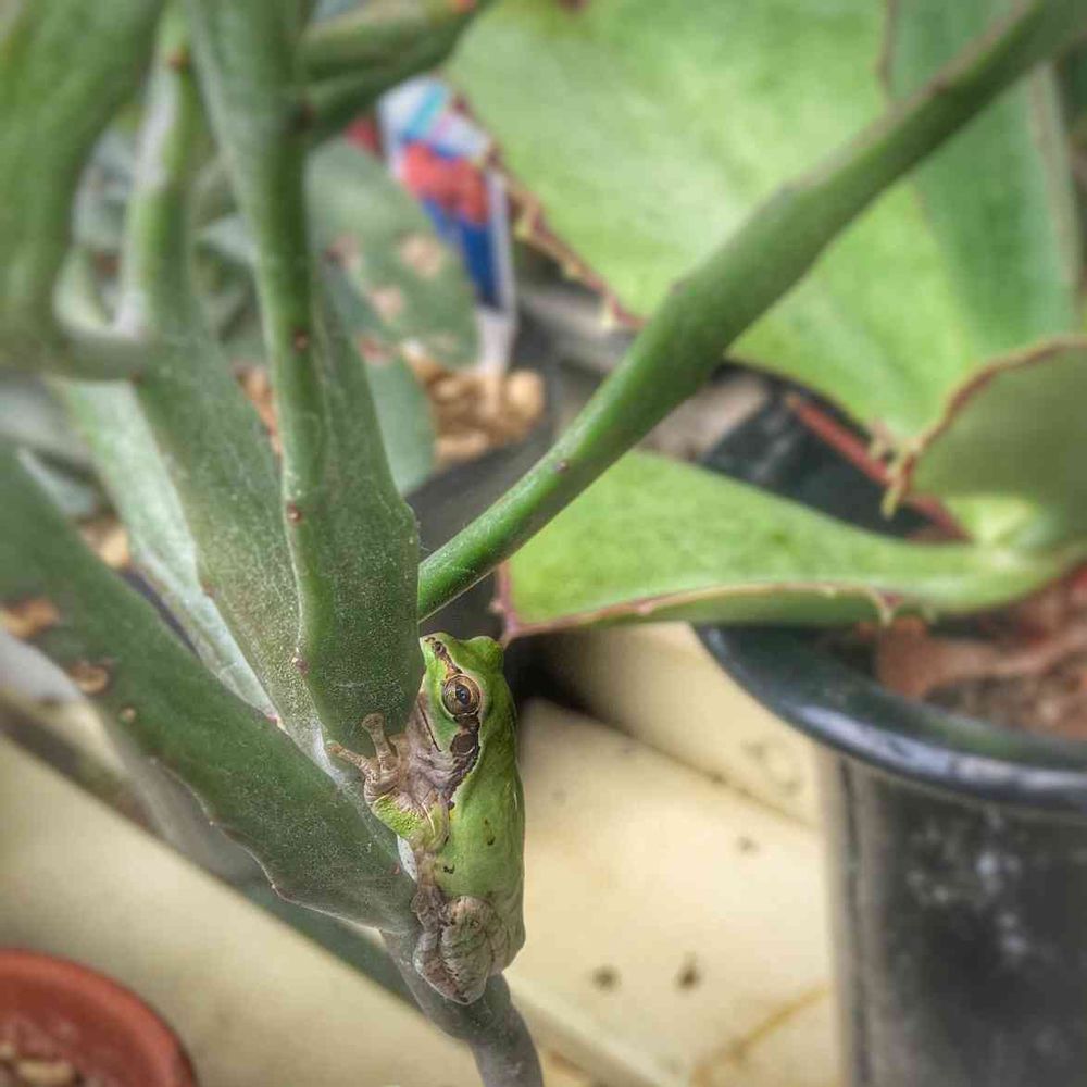 お出かけ先でユーフォルビアにしがみつくかえる発見。