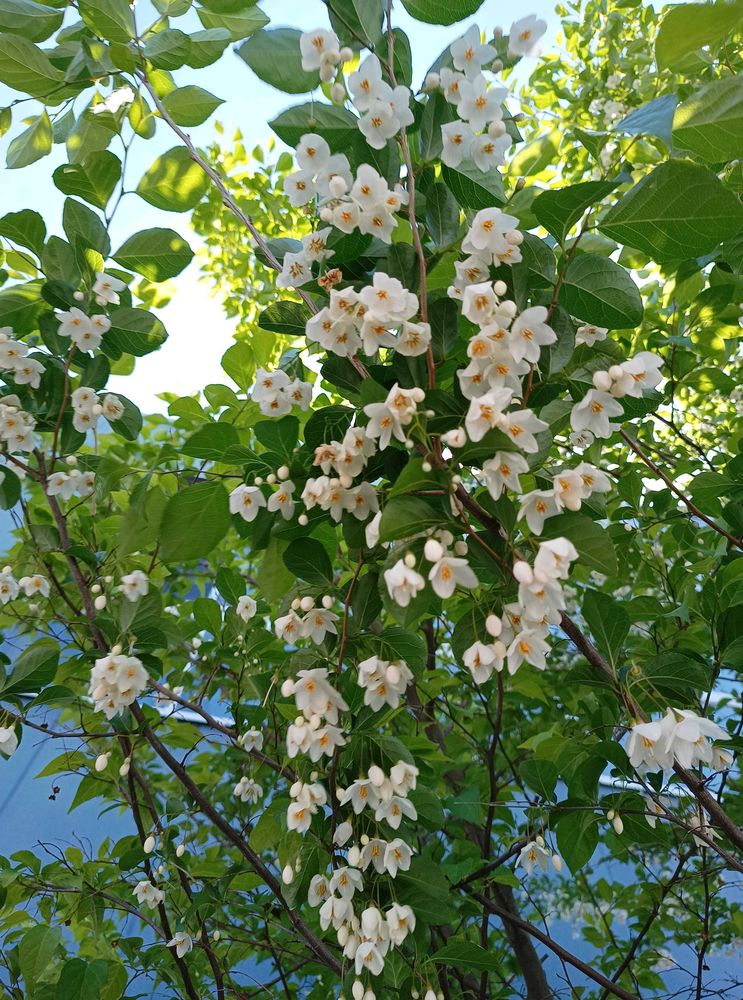 初夏、枝いっぱいに雪のように白い花を吊り下げます。英国で「スノーベル(雪の鐘)」と名付けられているとおり、大変美しいです。