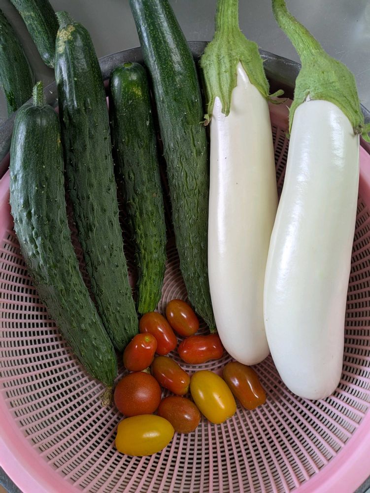 ふわトロ白長ナスをキュウリと一緒に収穫しました。