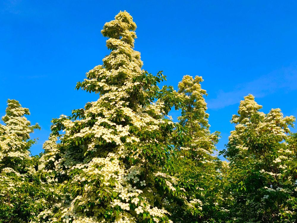 青空 + 常緑ヤマボウシの濃い緑色の葉と上品な白色のお花の組み合わせがとても綺麗でした✨