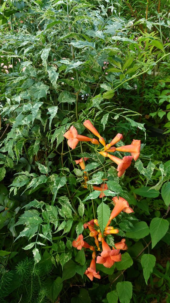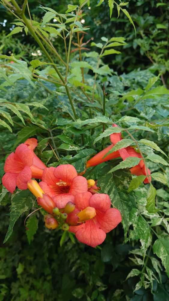 ノウゼンカズラ〜今年は咲始めました(昨年は咲かなかった😅)斑入り葉っぱ涼しげで、花は情熱的だよね〜🧡🧡🧡✨✨✨