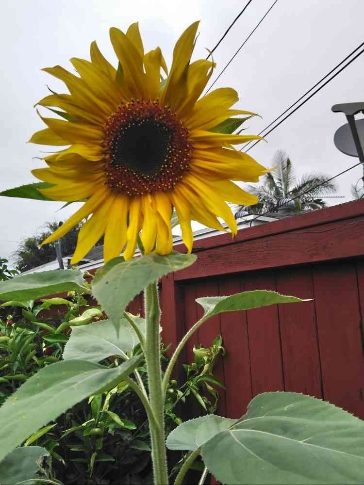 マンモス向日葵がやっと咲きました。種から2ヶ月ちょっと。デカい!!180cm以上はありそう🤗。
