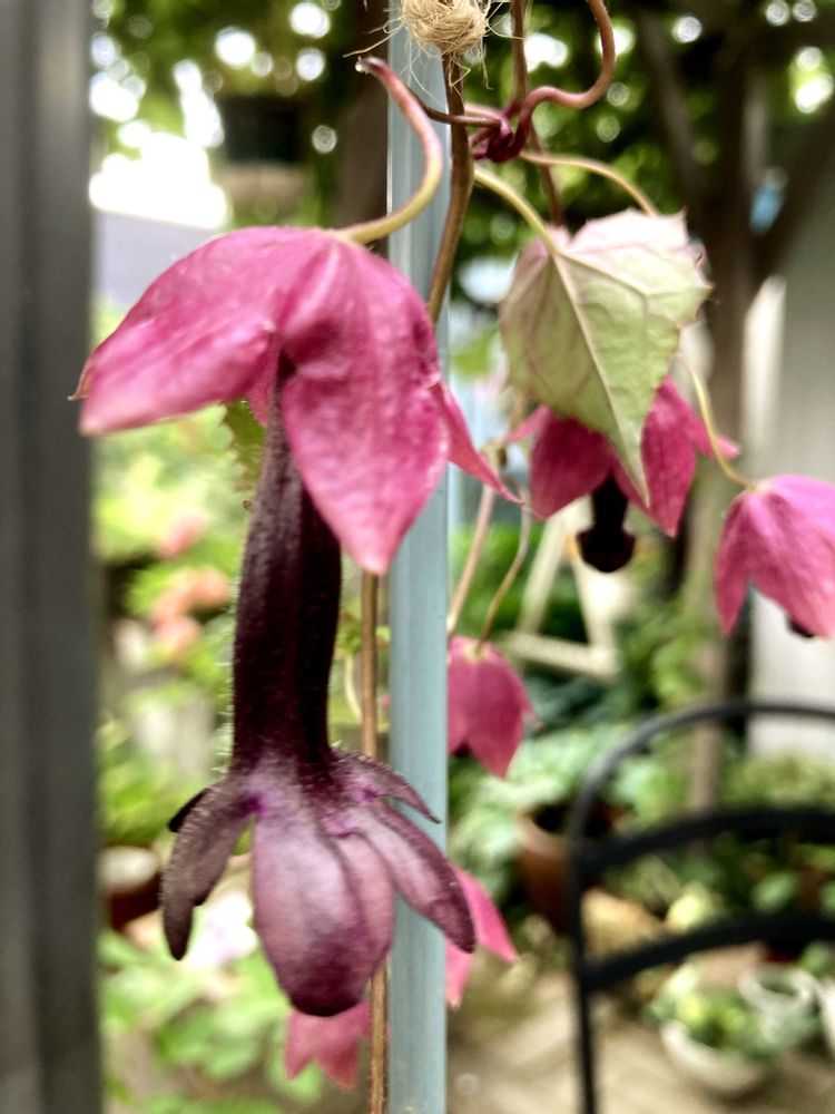 赤紫色のユニークな形の筒状の花が垂れ下がる様に咲き 花が終わると赤紫色のガクが残ります