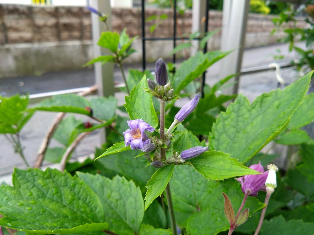 道路に面した柵に誘引しているクレマチスも見頃になりました🤍💜