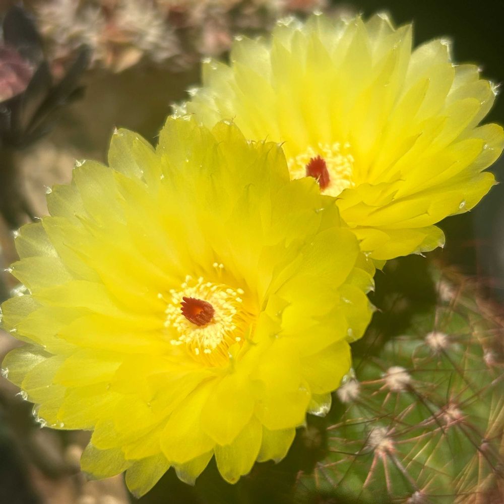 青王丸は、「青」とはありますが、赤い棘と濃い緑が綺麗なサボテンです。写真の通り、花弁はとても鮮やかな黄色で、中心の赤がオシャレです。