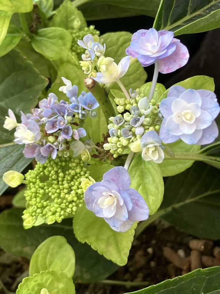 アジサイ・初恋 ちゃんが、2度目のツボミや幼いお花をつけてくれて とても可愛い色と形を楽しく眺めてます♪♪♪♪