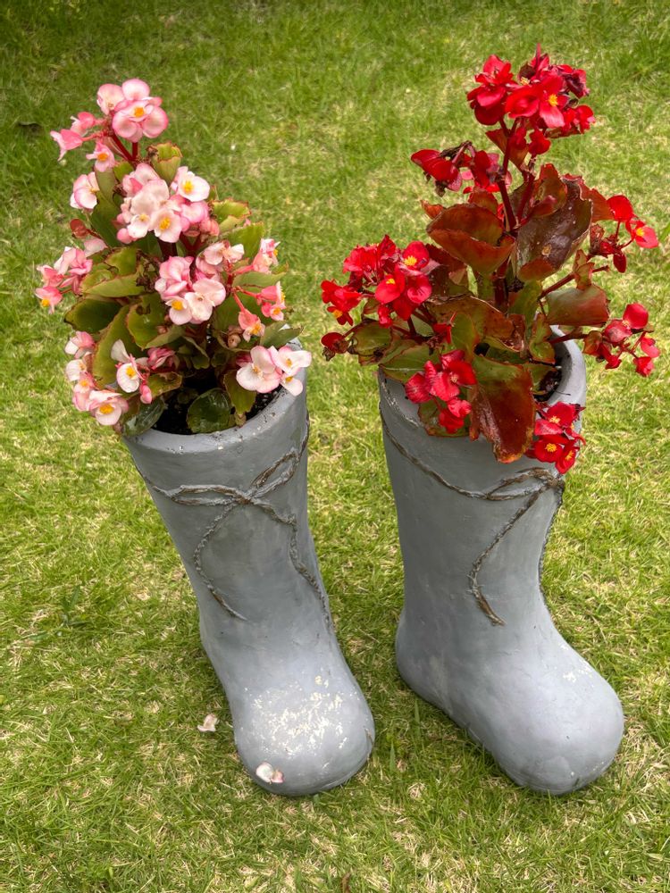 無駄に土を使うと思い、長靴👢の下へ発泡スチロールを入れてその上に土を入れました。