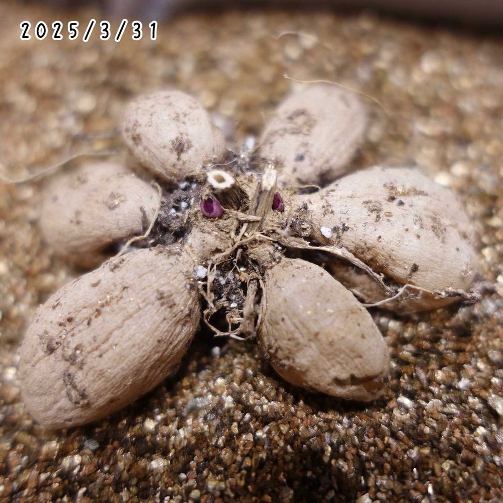 ③2025/3/31 冬越し後に芽が出た様子(芽が3つ出たため、切り分けて植え付けました)