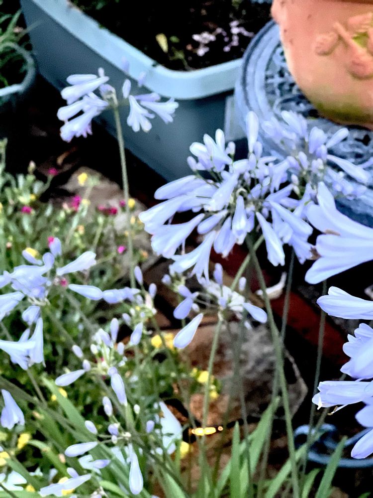 庭に植えた寄せ植えと、矮性のアガパンサスの写真です😊