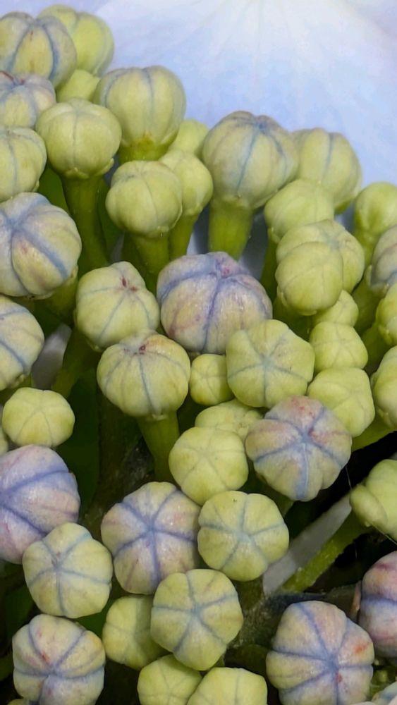 手毬のような蕾から小さな花がポチポチ咲いている🩵🟡💙🟡💙🟡🩵