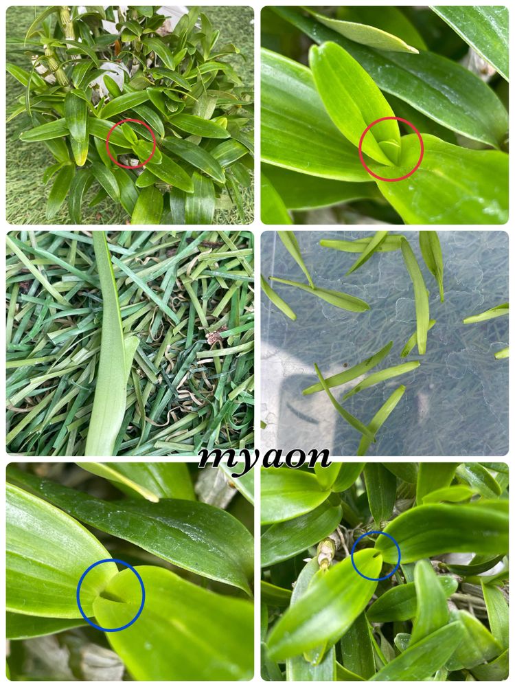 2枚目:デンドロビウム エンジェル ベイビー グリーン“愛” コンパクトサイズ(これ以上背丈を高くしたくない)に仕立てたいので新芽を抜く作業をしました。赤丸の中は新芽、青丸の中は新芽を抜いた後。伸びる成長をストップしたから横に太り出すのかな•́ω•̀)?