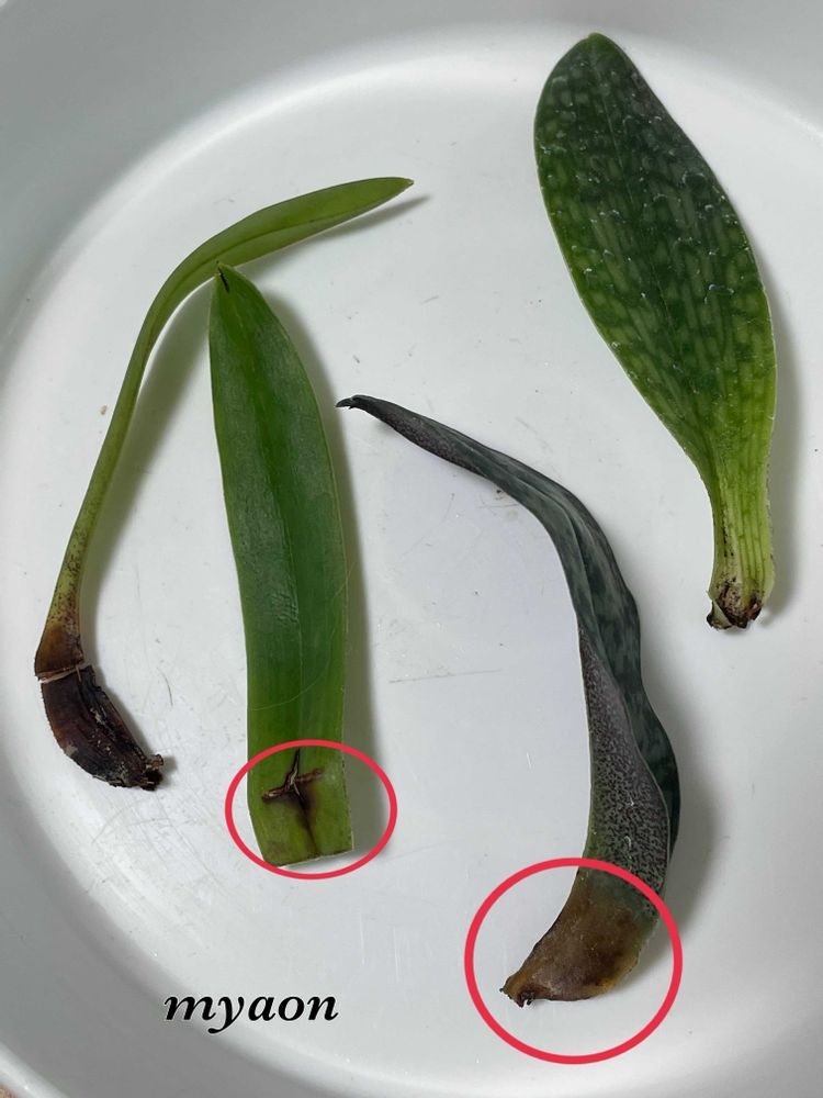 3枚目:高温高湿度の夜が危ないらしい⚠️赤丸⭕️パフィオペディルム の腐り。右と左は怪しかったので外しました。右は違ったかも、やっちまった…