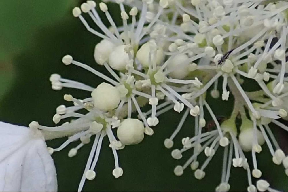 ②両性花のまん丸い蕾。5枚の花弁からなっているらしく、開花と同時に散ってしまう💦