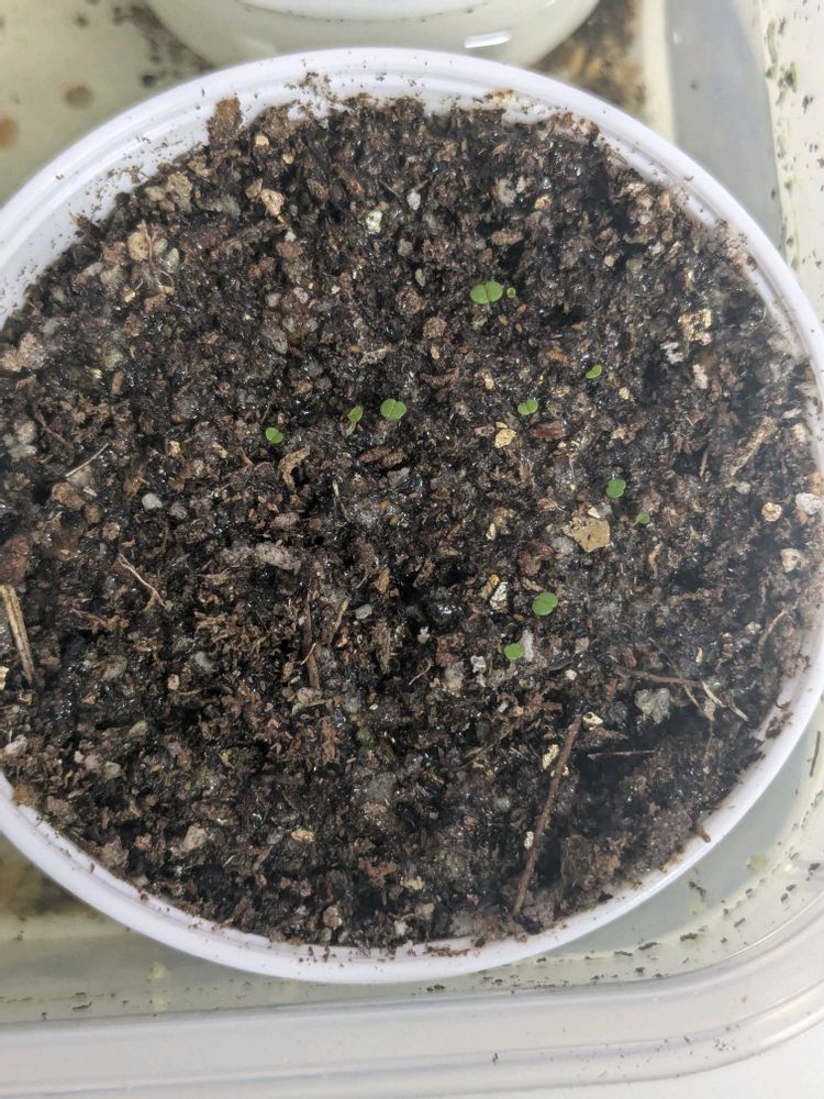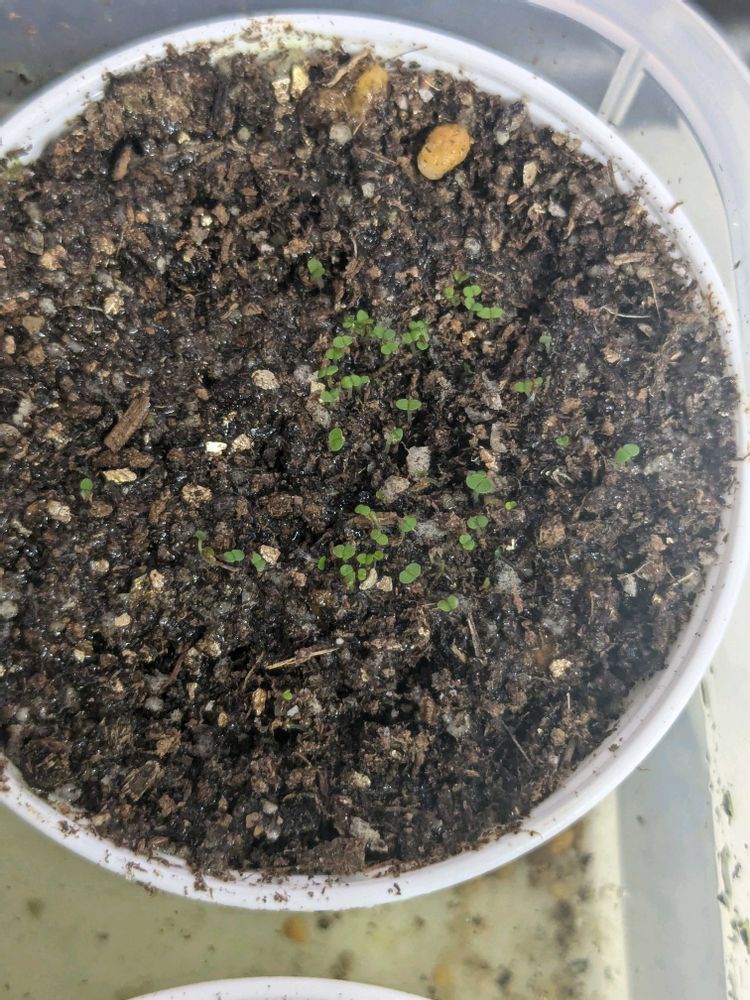 ③アフィニス・セルフさん。ちっちゃ〜〜〜い芽が沢山👀ホントに適当にばら撒いたのでスゴイ密度に💦雑も大概にしないと植え広げで苦しみそうです😨🤣セルフは出るのに交配は全くです😭同じようにやってるつもりなのに、難しいです😮💨交配しやすい組み合わせとしにくい組み合わせがあるような気がするんですよね💦