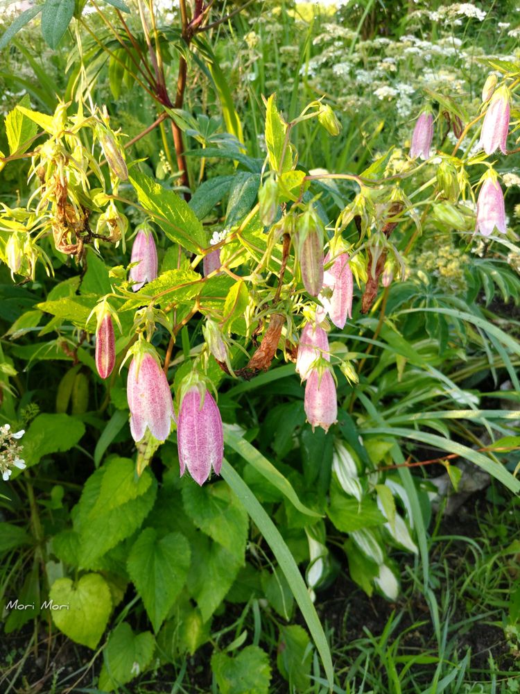 たくさんのいろんな緑が 混ざってホタルブクロ目立ちます〜